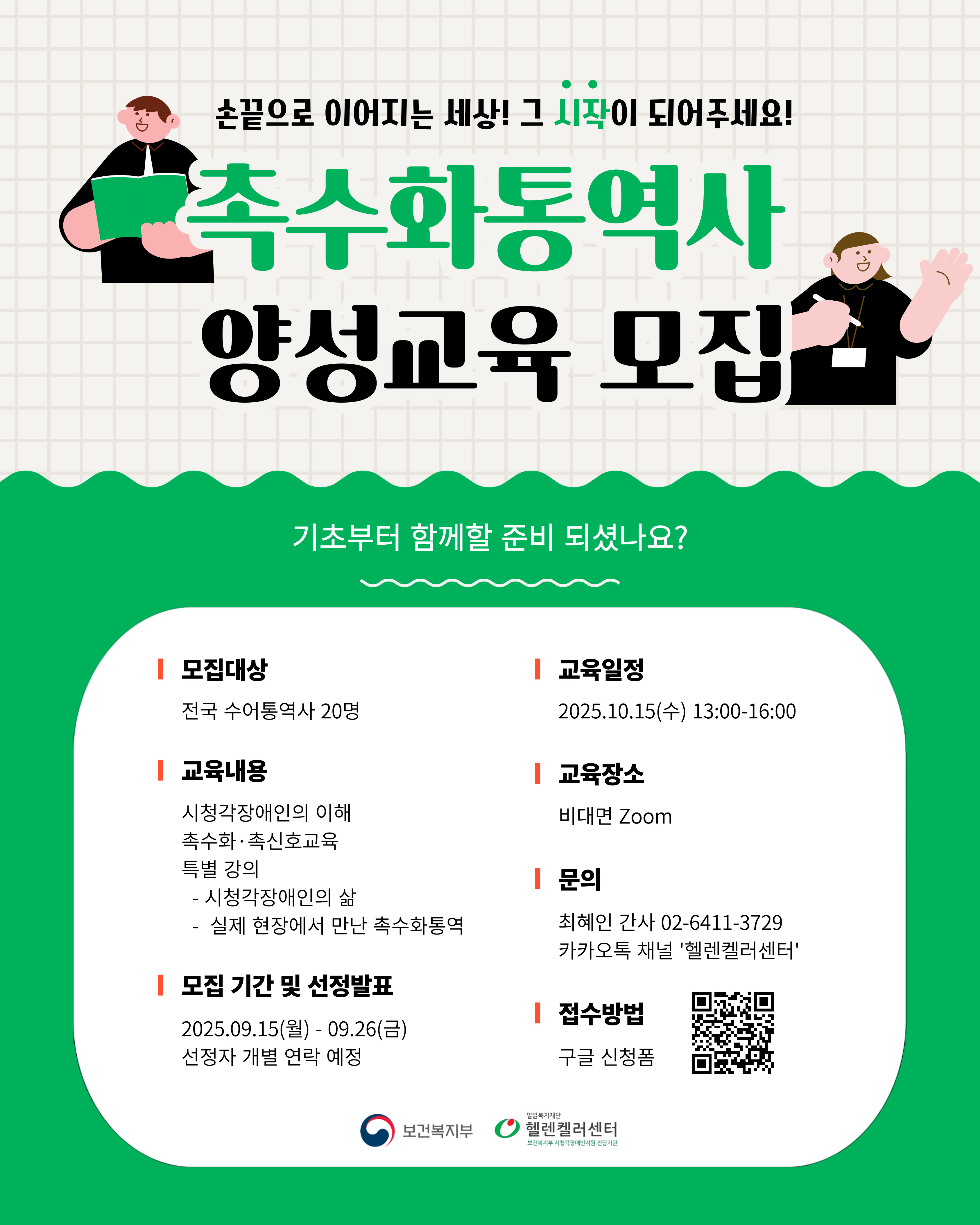 보건복지부 시청각장애인 지원 전담기관인 밀알복지재단 헬렌켈러센터(센터장 홍유미) 9 15일부터 26일까지시청각장애인 의사소통 전문가(촉수화 통역사) 양성교육기초과정에 참여할 교육생을 모집한다.