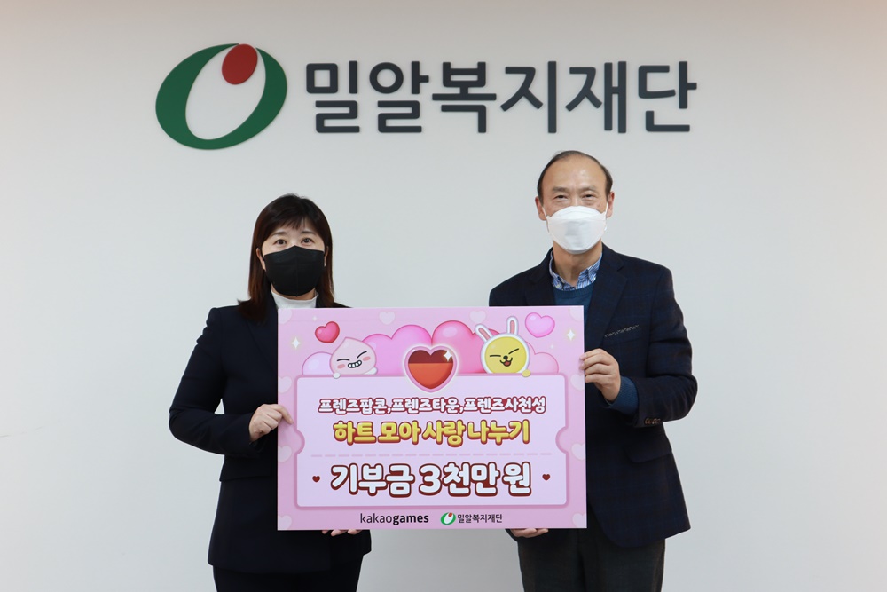 이번 기부금은 카카오게임즈가 지난해 연말 자사 모바일 캐주얼게임인 프렌즈게임 3종에서 진행한 ‘하트 모아 사랑 나누기’ 기부 캠페인으로 조성됐다. ‘하트 모아 사랑 나누기’는 지난해 12월 22일부터 31일까지 프렌즈팝콘, 프렌즈타운, 프렌즈사천성에서 이용자들이 하트 2,022만 개를 소모하면 카카오게임즈가 기부금 3천만 원을 전달하는 사회공헌 이벤트다.