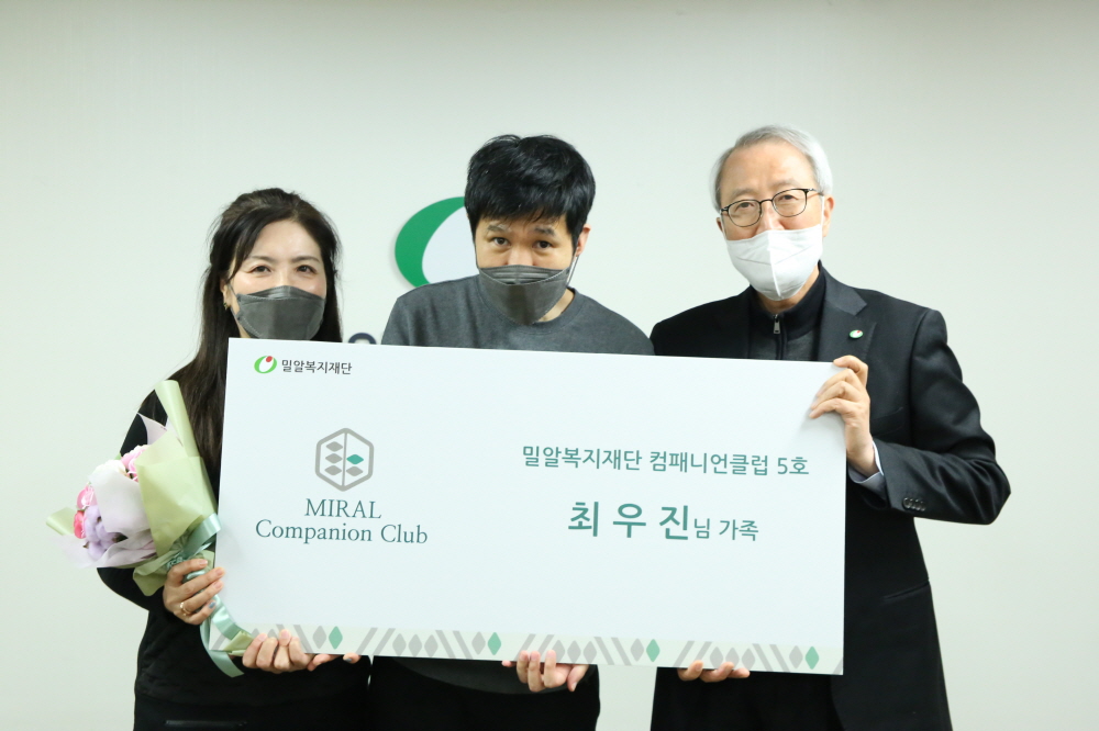 밀알복지재단(이사장 홍정길)은 지난 12일(수) 최우진(50)씨와 가족들을 고액후원자 모임 ‘컴패니언 클럽’ 5호 후원자로 위촉했다.