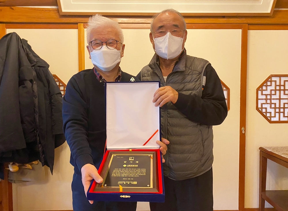 [사진2] (왼쪽부터) 밀알복지재단 홍정길 이사장이 송내사랑의교회 박명배 목사에게 감사패를 전달하고 있다.