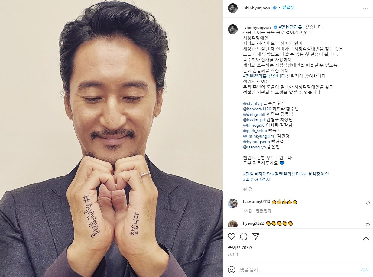 신현준은 “세상과 단절된 채 살아가는 시청각장애인을 찾는 것은 그들이 세상 밖으로 나갈 수 있는 첫걸음이 된다”며 “촉수화와 점자를 사용하여 세상과 소통하는 시청각장애인을 떠올릴 수 있도록 손에 손글씨를 직접 적어 챌린지에 참여했다”고 밝혔다.