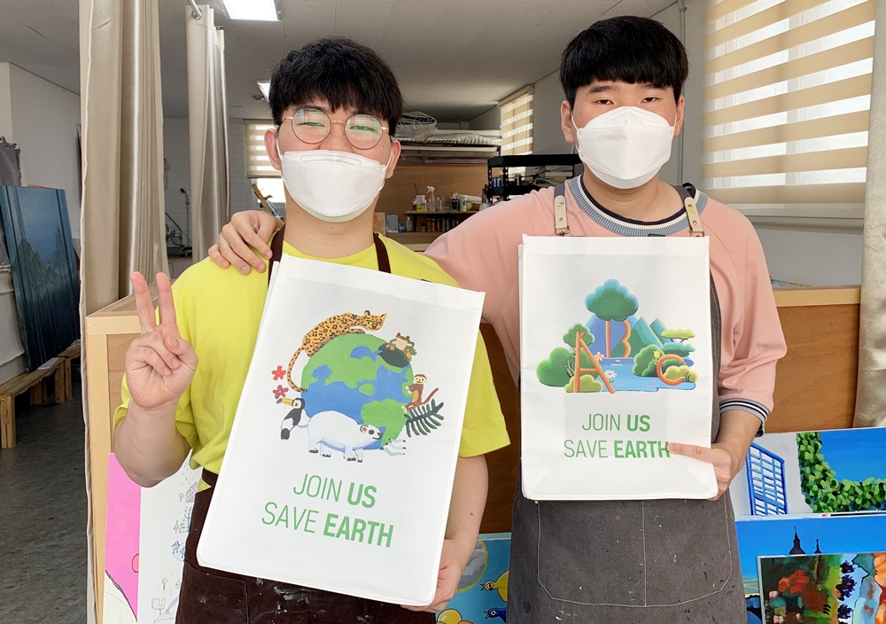 다회용 쇼핑백에는 밀알복지재단의 발달장애인 예술단 ‘브릿지온 아르떼(Bridge On Arte)’ 소속 작가들이 환경 보호를 주제로 완성한 일러스트가 담겨 의미를 더했다. 김승현 작가는 자연 풍경 속에 알파벳을 더해 환경 보호에 대한 메시지를 표현했으며, 최석원 작가는 사람들의 따뜻한 관심이 필요한 멸종 위기 동물들을 그려 넣었다.