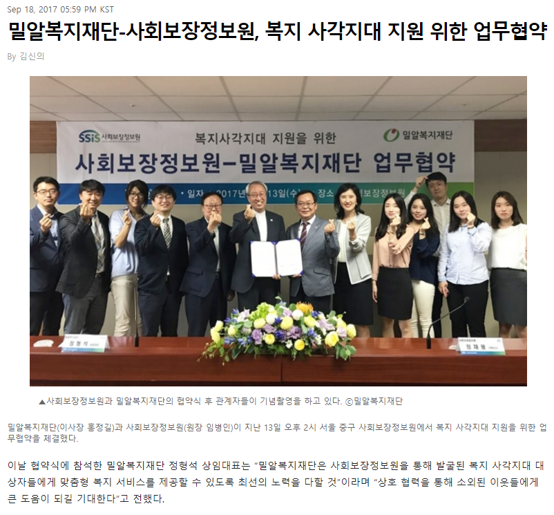 [크리스천투데이] 밀알복지재단-사회보장정보원, 복지 사각지대 지원 위한 업무협약