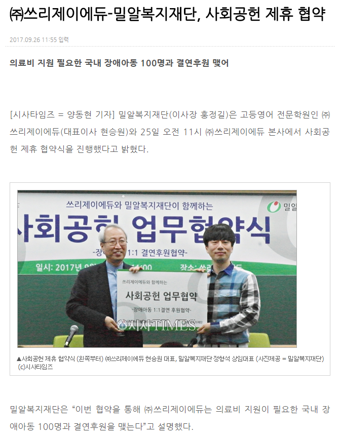 [시사타임즈] ㈜쓰리제이에듀-밀알복지재단, 사회공헌 제휴 협약