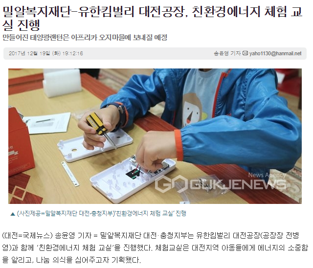 밀알복지재단-유한킴벌리 대전공장, 친환경에너지 체험 교실 진행 <국제뉴스 기사보기>