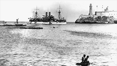 <1898년 1월 25일 쿠바 아바나항에 들어서고 있는 미국 전함 메인호. 메인호는 3주 후인 2월 15일 정체불명의 폭발로 파괴되었고, 이는 미국-스페인 전쟁의 도화선이 되었다.> *파리조약
