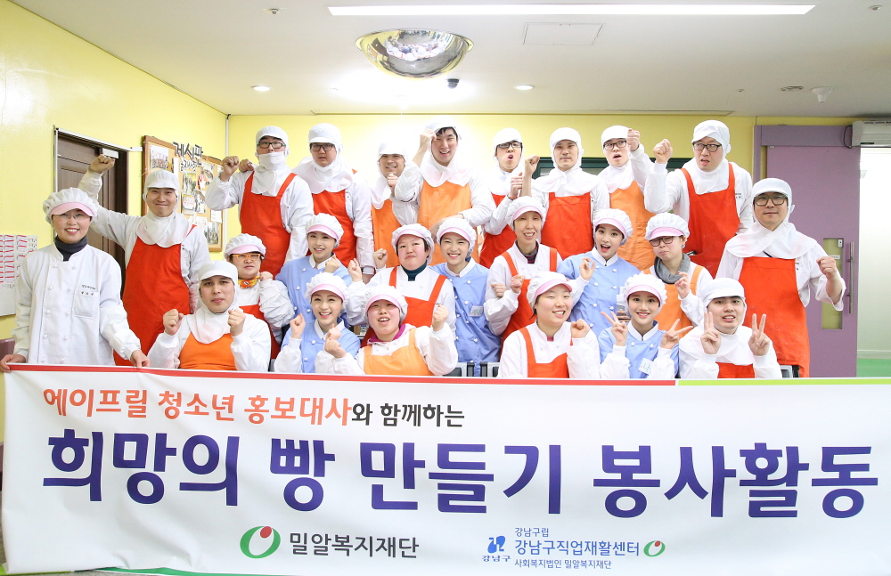 이날 에이프릴은 위촉식과 함께 봉사활동도 펼쳤습니다. 에이프릴은 강남구직업재활센터 내 장애인직업재활시설인 밀알베이커리의 장애인 근로자들과 함께 단팥빵을 만들었는데요. 에이프릴과 장애인 근로자들이 함께 만든 빵 200개는 강남구직업재활센터를 이용하는 장애인들에게 기부됐습니다.