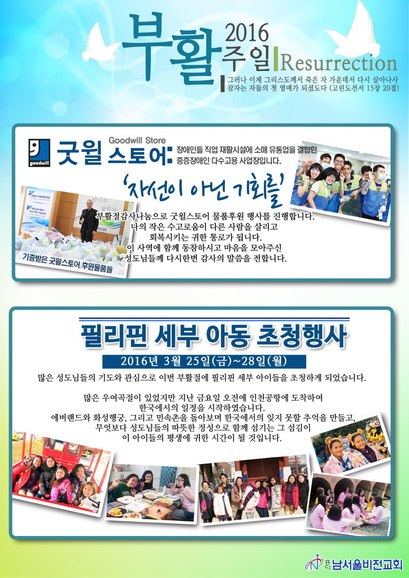 지난 3월 27일(일), 부활절을 맞이하여 흥덕남서울비전교회(담임목사 양용전)에서 특별한 예배가 마련되었습니다. 우리재단 필리핀 지부가 위치한 세부의 아이들이 결연을 맺고 있는 흥덕남서울비전교회의 초청으로 한국을 방문하게 되어 이날 함께 초청행사에 참여하게 되었습니다. 이날 진행된 부활절 낮 예배에는 우리재단 정형석 상임대표가 ‘은혜, 감사, 섬김’이란 제목으로 설교하였으며, 오후예배에는 필리핀 지부 황영희 지부장의 설교가 이어졌습니다.