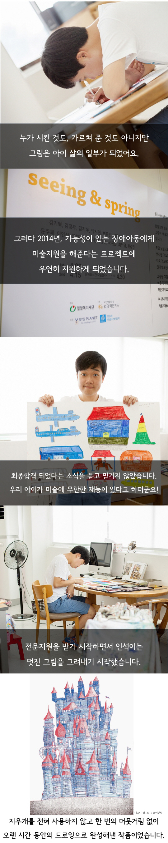 우리재단이 서울 강남구 일원로 밀알학교 1층 밀알미술관에서 개최하고 있는 제3회 ‘봄 프로젝트’ 전시회에서 만난 이인석(24)씨와 어머니 기은숙(51)씨 이야기입니다. 이인석씨는 미술 등 특정한 부분에서 우수한 능력을 가진 ‘서번트 증후군’의 소유자입니다.