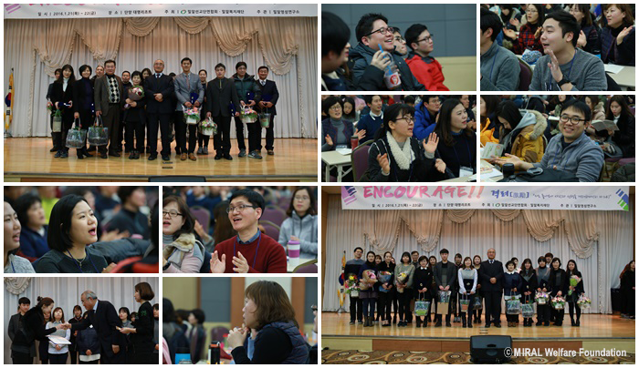 지난 1월 21일(목)부터 1월 22일(금)까지 1박 2일 일정으로 단양 대명리조트에서 2016년도 밀알복지재단 시무식 및 전직원 신년 워크샵이 진행되었습니다. 우리재단 법인사무처를 비롯하여 전국의 7개 지부 및 48개의 산하시설 직원들이 모여 서로를 돌아보며 격려하는 시간을 가졌습니다.