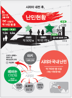 유엔난민기구(UNHCR)에 의하면 시리아 국내 난민의 수는 760만 명이며, 국외로 탈출한 난민이 400만 명에 이르는 것으로 나타났다. 시리아 인구 1,160만 명의 절반 이상이 인도주의 구호가 필요한 상태에 놓여있는 것이다.