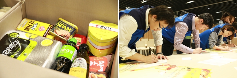 ▲ '풍성한 추석맞이 선물키트'(왼쪽), 카드를 쓰고 있는 동양생명 임직원들(오른쪽)