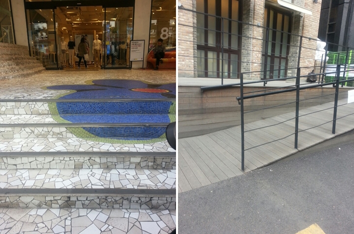 강남하면 역시 쇼핑! 큼직큼직한 브랜드들을 쉽게 찾아볼 수 있는데, 과연 편의시설도 잘 갖추어져있는지 살펴보았다. 엘리베이터가 있는 강남역 10번 출구 라인의 상점들부터 살펴본다면, 출구 바로 앞에 위치한 에잇세컨즈의 입구는 계단이었다. 하지만 뒤편 입구에는 경사로가 설치되어 있어서 충분히 휠체어로 이동이 가능했다. 평소 색색의 타일이 붙여진 입구 계단이 아름답다고 생각했었는데, 경사로가 앞쪽에 생긴다면 더 편리하고 시원해보일 것 같았다. 대부분의 브랜드 매장들이 입구가 계단으로 되어있고, 위, 아래층으로 이동하려면 계단을 이용하거나 에스컬레이터를 타야했다. 엘리베이터가 있더라도 2, 3, 4층은 운행하지 않았는데, 별다른 표시가 되어있지 않아 당황스러웠다. 또한 입구 계단들은 대부분 2단이거나 3단인 경우가 많아서 높지 않은 문턱이지만 이동할 수 없다는 점이 안타까웠다. 미쏘에는 내부 엘리베이터가 있어서 반가웠지만 입구가 계단이어서 도움을 필요로 했다.