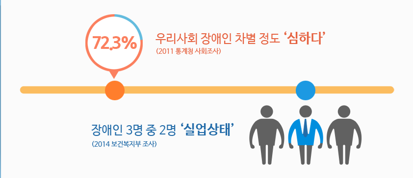 2011년 통계청 사회조사에 따르면 우리사회의 장애인 차별 정도에 대해 ‘심하다’고 답한 사람이 무려 72.3%라고 합니다. 물론 우리나라는 1990년에 제정된 장애인 고용촉진법부터 시작하여 장애인 차별금지법 도입 등 장애인의 권리보장을 위해 노력하고 있습니다만, 장애인의 취업률이 비장애인의 절반 수준에도 미치지 못하고 있는 현실과 장애인의 평균임금이 비장애인에 비해 턱없이 낮은 점, 그리고 종종 기사화되는 공인들의 장애인을 향한 비하발언 등은 우리사회에 여전히 장애인을 향한 편견이 자리잡고 있음을 보여주고 있습니다.