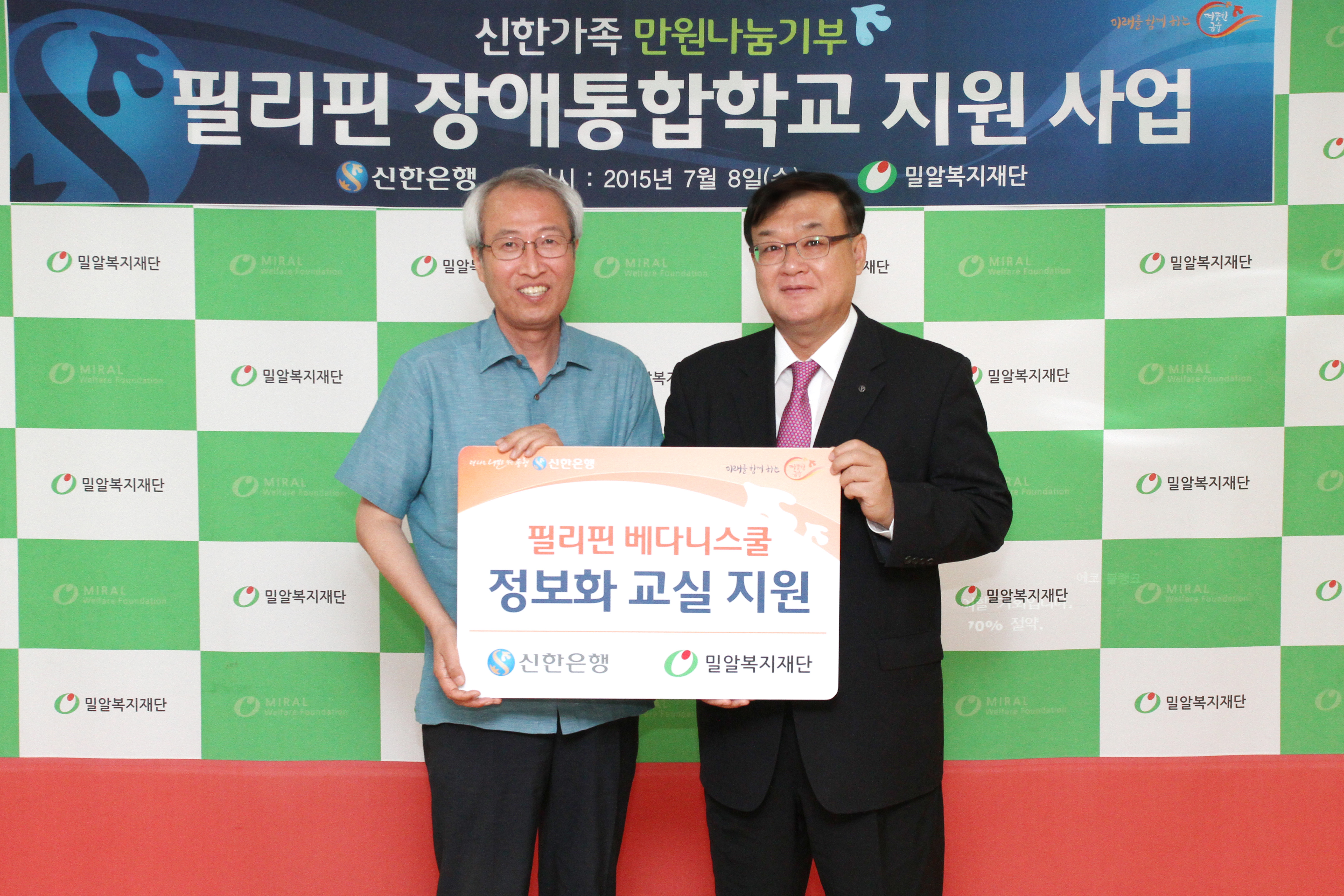 신한은행 왕태욱 부행장은 서울 강남구 수서동 밀알복지재단에서 열린 기부금 전달식에서 “교실이 부족해 장애아동들이 수업을 받는데 어려움이 있다는 이야기를 전해 듣고 통합학교 건물을 증축하는 일이 시급하다고 판단해 기부하게 됐다” 며 "필리핀 장애아동 교육환경 개선사업을 통해 글로벌 미래세대 육성을 위한 신한은행의 따뜻한 금융이 세계로 전파될 수 있는 계기가 되기를 바란다”고 말했습니다.