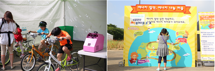 시민들은 이번 행사에서 자전거를 타면서 전달되는 동력에너지를 이용한 비누방울만들기와 햇빛을 이용한 선풍기 돌리기 등 자가발전을 체험해 볼 수 있었고 에너지 절약과 나눔에 대한 약속을 퍼즐판에 붙이기도 하는 등 에너지 절약에 대한 인식을 높이는 다채로운 행사에 참여하였습니다.