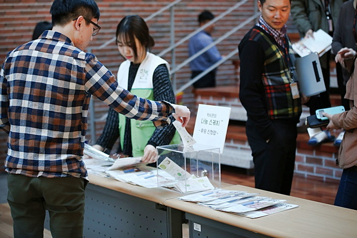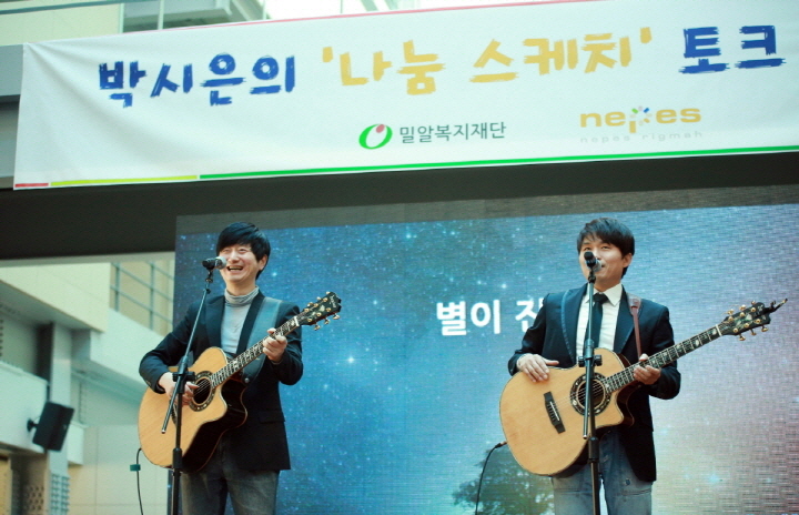 충북 청주에 위치한 ㈜네페스에서 200여명의 임직원이 참석한 가운데 처음으로 문을 연 ‘박시은의 나눔스케치’는 여행스케치의 대표곡 <왠지 느낌이 좋아>로 설레임 가득한 오프닝을 알렸으며, 이어 등장한 박시은 홍보대사의 매끄러운 진행으로 열기를 더했습니다.
