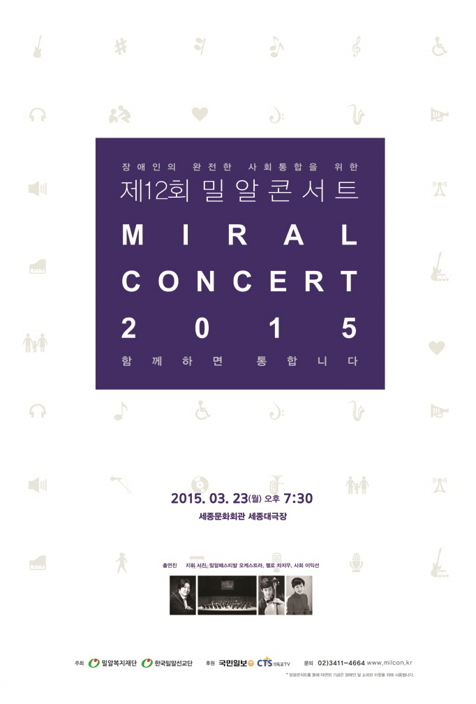 3월 23일 오후 7시 30분, 세종문화회관에서 열리는 제12회 밀알콘서트. 장애인과 비장애인이 함께 살아가는 하모니를 이뤄낼 연주자로 당신을 초대합니다. 여러분의 참여가 '함께'를 만들어 갑니다.