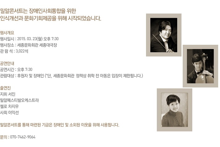 다가오는 3월 23일, 세종문화회관에서 열리는 밀알콘서트 무대 위에 서게 될 다른 비장애인 연주자들과 마찬가지로, 지우 역시 오늘의 연주를 위해 오랜 시간의 땀과 눈물, 그리고 가능성을 포기하지 않는 순수한 열정이 필요했을 것입니다. 우리에게 그들의 연주가 위로와 감동으로 다가오는 이유는, 연주자들이 보내온 인고의 시간들이 켜켜이 쌓여 견고한 소리를 내기 때문이 아닐까요?