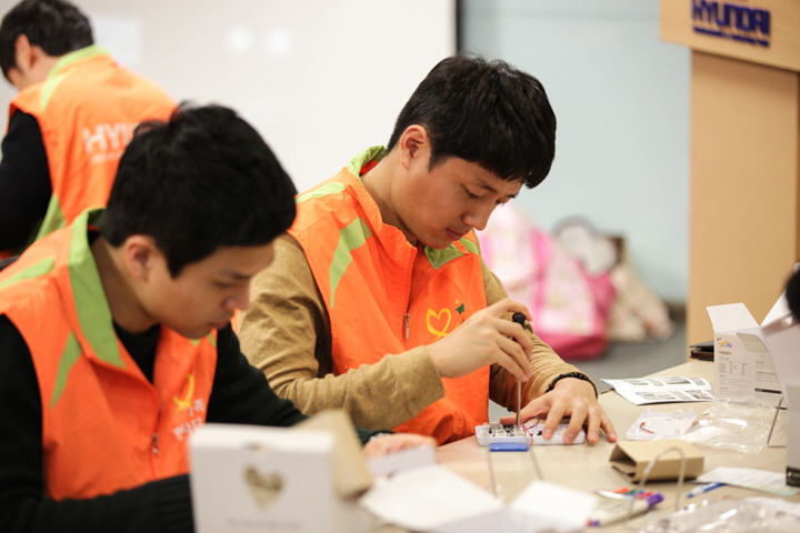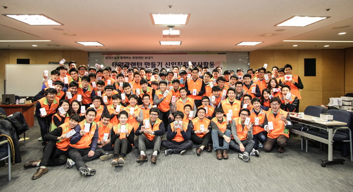현대건설 2015년 상반기 신입사원 160여명은 태양광 랜턴 만들기 봉사활동을 진행했습니다. 직원들은 우간다에 보내질 1,300여개의 태양광랜턴을 조립하였으며 함께 보낼 희망편지도 작성하여 뜻깊은 나눔의 시간을 보냈습니다.