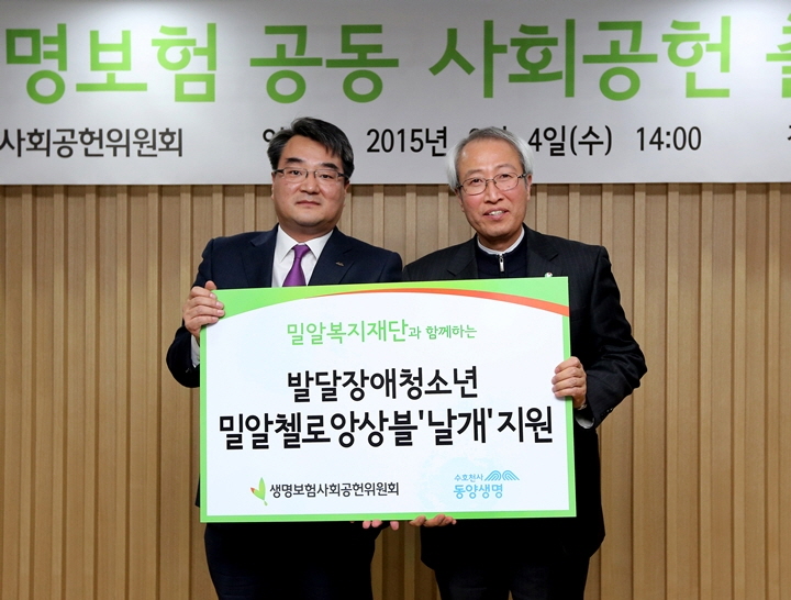 이후 생명보험사와 사회복지단체, 공인단체등으로 구성된 지정법인의 출연금 전달식이 진행되었으며, 이 자리에서 밀알복지재단은 동양생명으로부터 발달장애청소년 밀알첼로앙상블 '날개'지원을 약속받았습니다. 우리재단은 2012년부터 동양생명의 지원으로 첼로에 재능을 보이는 발달장애 아동 및 청소년들로 구성된 밀알첼로앙상블 '날개'를 구성해 활동하고 있습니다. 지난해에는 생명보험사회공헌위원회와 동양생명의 후원으로 제2회 밀알첼로앙상블 '날개' 정기연주회를 개최하기도 했습니다.