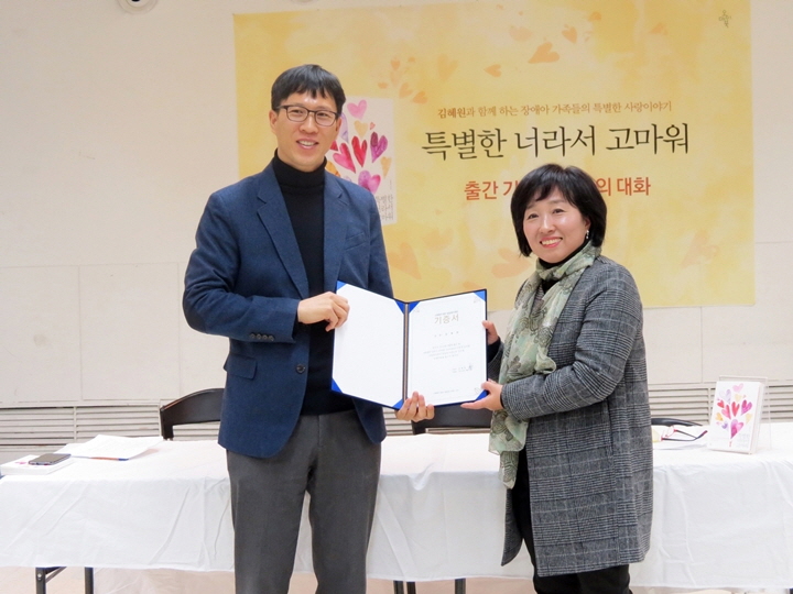 “부족한 글이 누군가에게 위로가 되고 기쁨이 된다면 이보다 더 큰 보람이 없을 것이다.” 며 감사의 마음을 전한 저자 김혜원 기자는 <특별한 너라서 고마워> 책의 인세 중 일부를 밀알복지재단에 기부했습니다. 지난 1년 동안 오마이뉴스와 공동기획으로 진행해온 ‘장애아 부모로 산다는 것’, 그 이야기가 ‘특별한’ 책이 되고 공감하고 응원하는 사람들이 늘어나고 있습니다. 책의 주인공들이 한 곳에 모여 더욱 특별했던 출간기념식 현장. 모두에게 ‘특별한 너라서 고마워’라고 감사의 마음을 전하고 싶습니다.
