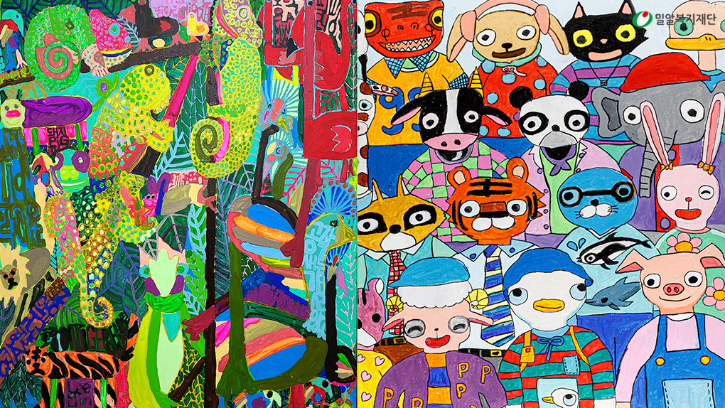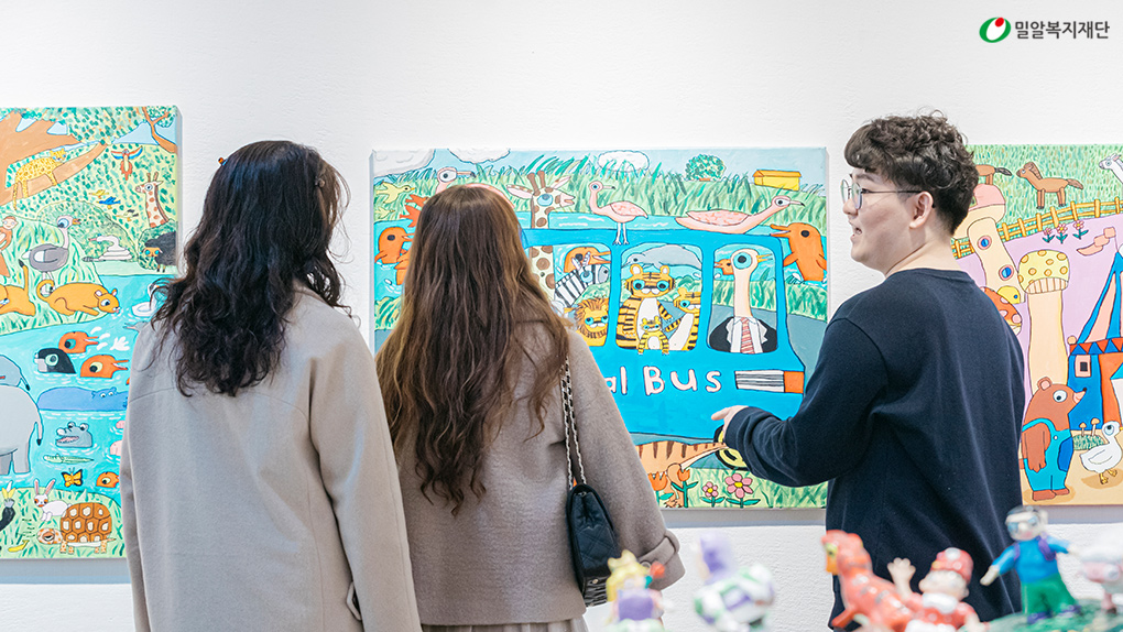 그다음으로는 아프리카 동물들의 재미있는 표정을 보여주는 현승진 작가의 그림이 있었습니다. 고향의 그리움을 건물만으로 그려냈던 윤인성 작가의 회화 속에는 사람이 등장하기 시작하며 스토리의 풍성함을 더했습니다. 사람들의 시선을 한 몸에 받은 ‘티티와 미미’를 그린 김지우 작가는 최근 고양이 그림이 SRT 캐릭터 공모전에 당선되고, 장학금을 받는 등 미술작가로서 무한한 가능성을 보이고 있습니다. 역동적인 사람을 그리는 전민재 작가는 작년 11월 밀알복지재단을 통해 DS투자증권에 미술작가로 취업하였고, 교육지원을 함께 받고 있습니다.