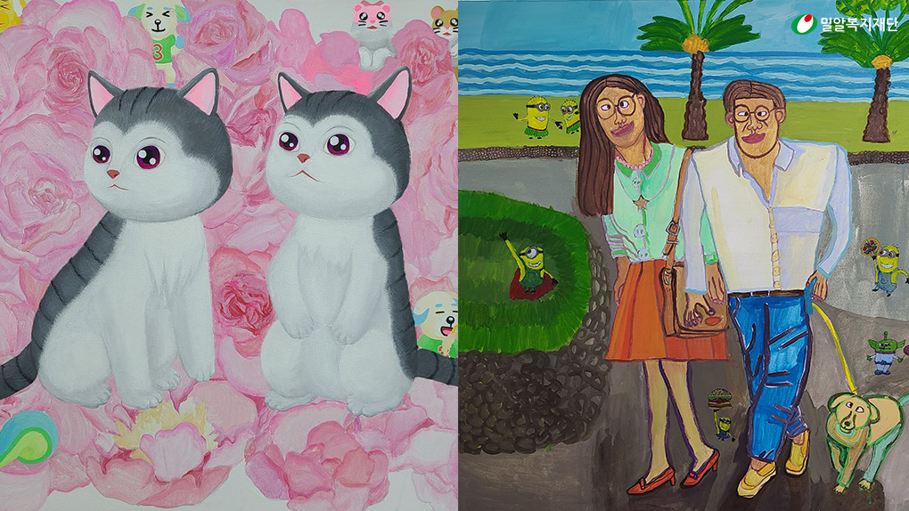 (좌)김지우 작가 '꽃벤치에 휴식하는 티티와 미미', (우)전민재 작가 '제주도 산책'