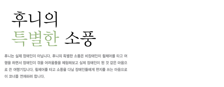 Lamp는 세상을 밝혀 따뜻하게 하자는 의미로 7명으로 구성된 자원봉사단입니다. Lamp의 봉사자들은 실제 장애인이 아닙니다. ‘조금 특별한 소풍은 일상생활을 하면서 장애인이 겪을 어려움들을 체험해보고 실제 장애인이 된 것 같은 마음으로 쓴 여행기입니다. 장애인들에게 편지를 쓰는 마음으로 이 코너를 연재하려합니다.