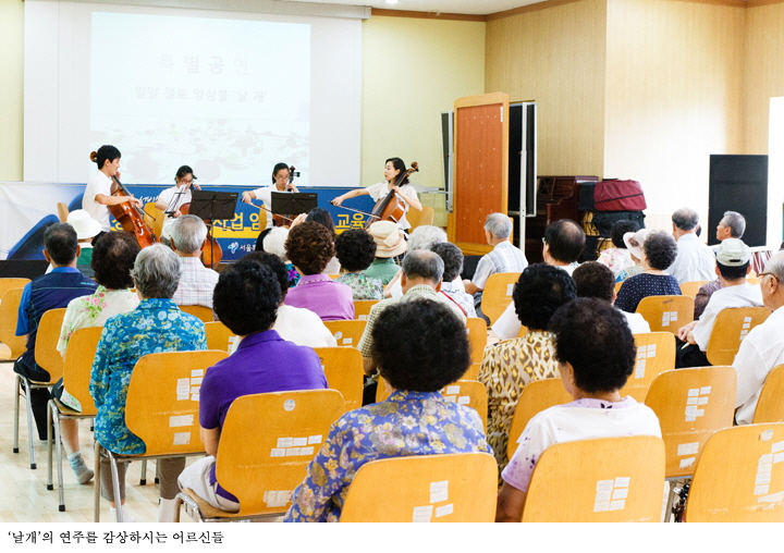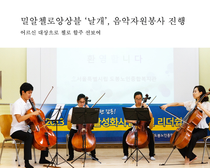 지난 8월 22일 밀알첼로앙상블 '날개'가 도봉노인종합복지관 대강당에서 음악자원봉사를 진행했습니다.