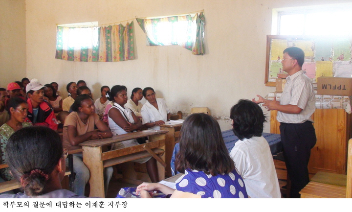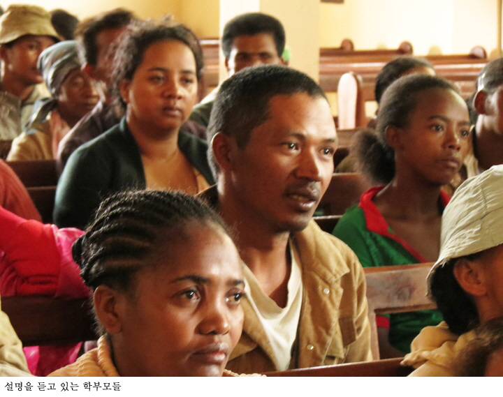 먼저 사업장을 담당하고 있는 현지 담당자가 사업장의 특성에 대해 설명한 뒤, 저희는 우리 재단의 성격과 목적에 대해 이야기했습니다. 그리고 해당 사업장에서 실행되고 있는 다양한 프로그램을 설명하는 동시에 아동들이 건강하게 자랄 수 있도록 성인이 될 때까지 도울 것이며, 이를 위해서 아동 개개인에 대한 정보를 수집하여 개별적으로 돌볼 것이라고 설명했습니다. 아동들이 건강하고 행복하게 자라기 위해서 학부모, 교사, 아동 모두 주인의식을 가지고 어려운 상황을 극복하기 위해 협력하는 것이 가장 중요하다고 강조했습니다. 그리고 부모는 아동을 돌보는 데 일차적인 책임을 가지고 있기 때문에 자녀를 학교에 항상 보내고, 전인적인 필요를 잘 돌보며, 사업장에서 진행되는 프로그램에도 적극적으로 협력을 해줄 것을 요청했습니다. 또한 가정 사정상의 이유로 이사를 가야할 경우 미리 사업장리더들과 상의하여 저희가 아동을 계속해서 돌볼 수 있는 방안을 논의할 수 있었으면 좋겠다고 요청했습니다. 설명이 진행되는 동안 부모들은 모두 내용에 집중하는 모습을 보였습니다.