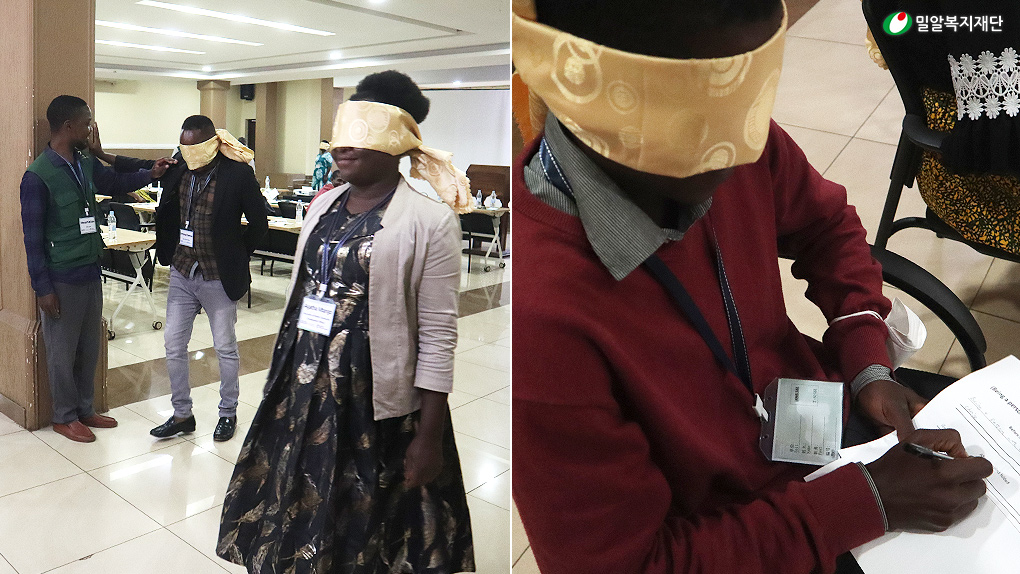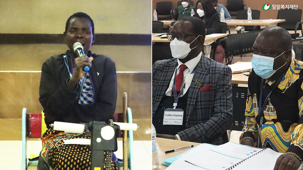 뿐만 아니라 밀알복지재단에서 지원 받고 있는 장애인 당사자, 제니퍼 세누웨일(Jenifer Senuwale) 씨가 참석해 밀알복지재단 사업을 통해 변화된 자신의 삶을 나누었습니다. 지체장애로 인해 일상생활에서 이동이 불편했던 제니퍼 세누웨일 씨는 밀알복지재단 말라위 사업장이 조직한 ‘장애위원회’를 통해 발굴되어 이동에 편리한 휠체어, 그리고 생계를 위한 식량 및 물품을 지원 받았습니다. 워크숍에서 제니퍼 세누웨일 씨는 “밀알복지재단을 통해 자립할 수 있는 직업 교육도 받고, 이동할 수 있는 휠체어도 지원 받아 내 삶이 이전보다 더 좋아졌습니다.”라며 밀알복지재단에 감사한 마음을 전했습니다. 그리고 정부 관계자들을 대상으로 장애인식개선 영화 시청 및 다양한 장애체험 활동도 진행했습니다. 정부 관계자들은 천으로 직접 눈을 가리고 걷거나, 글씨는 쓰는 등의 시각장애 체험을 해봄으로써 장애인에 대해 보다 더 깊이 이해할 수 있게 되었습니다.