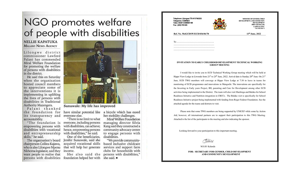 두 번째는, 밀알복지재단이 말라위 지방 및 중앙정부에서 영유아교육 정책수립을 위한 민관협력 네트워크 그룹 ECD TWG(EARLY CHILDHOOD DEVELOPMENT TECHNICAL WORKING GROUP)에 회원단체로 가입되어 활동하게 되었습니다. 이 네트워크 활동을 통해 밀알복지재단이 추진하고 있는 국가 교육 정책 및 제도 수립에 장애가 포용될 수 있도록 목소리를 내고자 합니다.