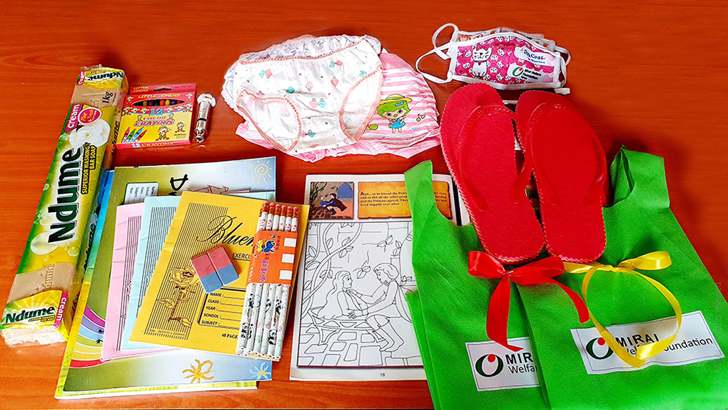 케냐 여아들을 위한 돌봄키트의 구성품 이에 밀알복지재단 케냐사업장은 결연아동이 위험에 노출되지 않도록 매주 유선으로 결연아동의 가정 상황을 살피고 있습니다. 또한 생계가 어려운 가족을 위한 식료품 키트 지원과 함께 성범죄의 위험에 노출될 가능성이 높은 여아들을 위한 Self-care 키트(이하 돌봄키트)를 제작하여 지원하였습니다. 5세~12세 여아들을 위한 돌봄키트는 범죄 발생 시 사용할 수 있는 호루라기, 위생과 보호를 위한 속옷, 코로나19 예방을 위한 마스크와 비누, 자가 학습을 위한 연필과 공책, 드로잉북과 크레용으로 구성되어 있습니다.