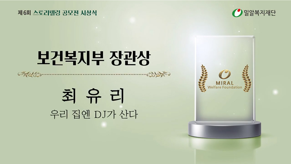 올해로 6회를 맞이한 스토리텔링 공모전 ‘일상 속의 장애인’은 밀알복지재단이 주최하고 보건복지부, 한국국제협력단, 국민일보, 에이블뉴스가 후원사로 협력해주었습니다. 6월 1일부터 7월 19일까지 진행된 응모기간동안 역대 최다인 총 427편의 수필이 접수되었으며, 그중최유리 씨의 ‘우리 집엔 DJ가 산다’가 보건복지부 장관상의 영예를 안았습니다.