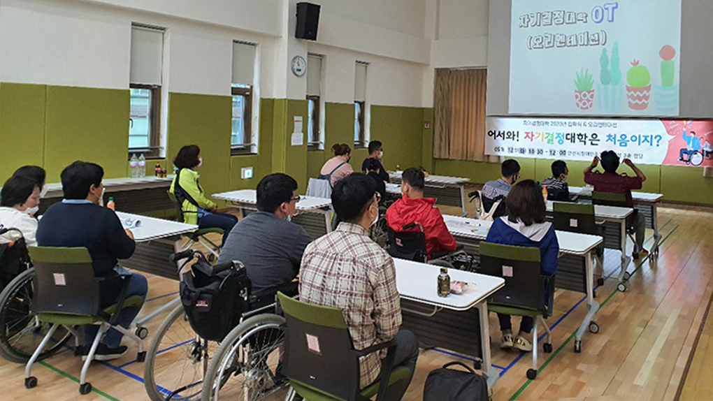 안산시장애인주간보호시설은 지난 5월 12일, 2020 경기도 장애인복지시설의 재활프로그램인 '어서와! 자기결정 대학은 처음이지?' 오리엔테이션을 가졌습니다. 뇌병변 중복성인장애인들은 프로그램을 통해 자신의 삶의 문제를 스스로 결정하는 지식과 방법을 습득해 자신의 삶의 결정자가 될 수 있는 교육을 받았습니다.