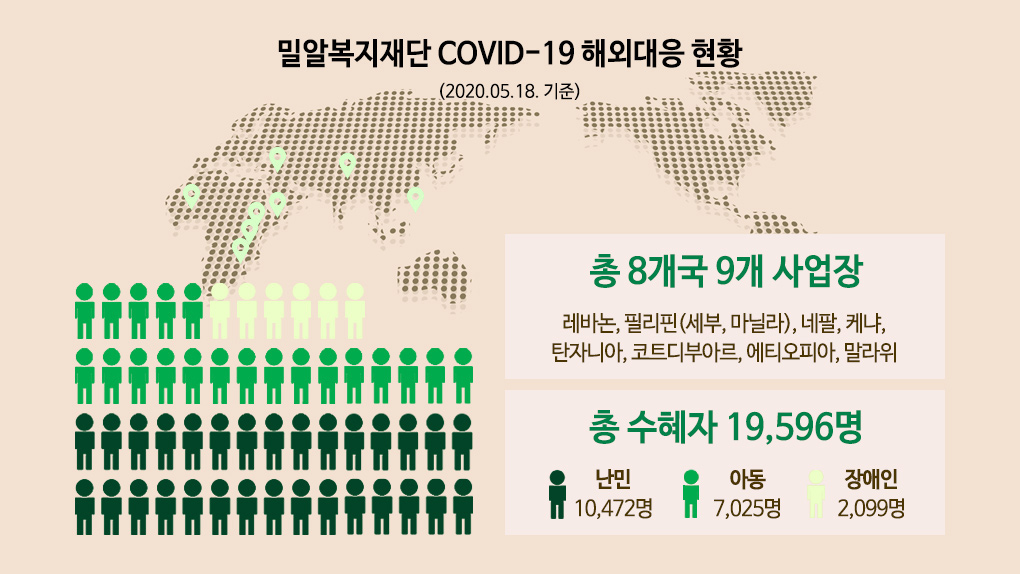 밀알복지재단은 코로나19 발생 이후 해외 8개국 9개 사업장의 취약계층(장애인, 아동, 난민) 총 19,596명을 위해 면마스크를 포함한 위생키트와 식량키트를 지원하였습니다. 효과적인 지원을 위해 우선 비대면 방식(SNS 및 전화)으로 사전조사를 실시하여 장애인, 아동, 난민 각각의 구체적인 어려움이 무엇인지 조사하고 시급한 물품들이 우선적으로 지원하였습니다.