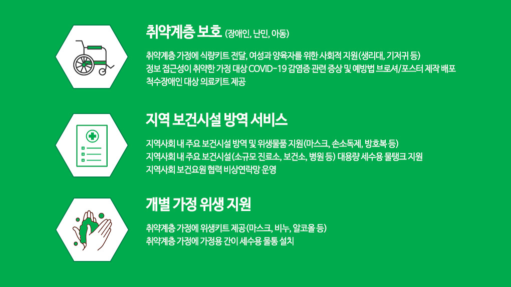 코로나19 사태가 장기화 되면서 경제적 어려움을 겪는 취약 가정과 어린이, 난민들을 위해서는 필수 식량과 생필품, 개인위생용품으로 구성된 구호 키트를 지원하여 생계를 도왔습니다. 마을에 위치한 진료소, 보건소, 병원을 대상으로는 필요한 방역과 세수용 물탱크를 지원하고, 의료용 방호복, 마스크, 손소독제 등을 지원했습니다. 정보부족을 겪는 장애인들을 위해 브로셔/포스터 등을 제작하여 필요한 정보를 전달하고 지역사회 보건인력과 협력하여 비상연락망을 운영하여 이들의 건강상태를 일일이 확인하고 있습니다. 뿐만 아니라 중증 장애인들의 장애 악화 방지를 위해서 의료키트도 함께 지원하고 있습니다.