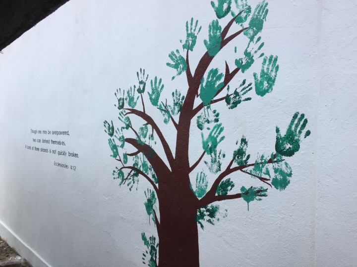 캠프의 마지막 프로그램으로, 다함께 협동하여 멋진 벽화를 완성했습니다. 벽에 미리 앙상한 나뭇가지만 그려놓고, 아이들이 손에 장갑을 끼고 페인트를 묻혀 손바닥을 찍어 잎을 완성했습니다. 앙상했던 나무에 스물 네 개의 작은 손이 모이자, 푸르고 멋진 나무가 탄생했습니다.