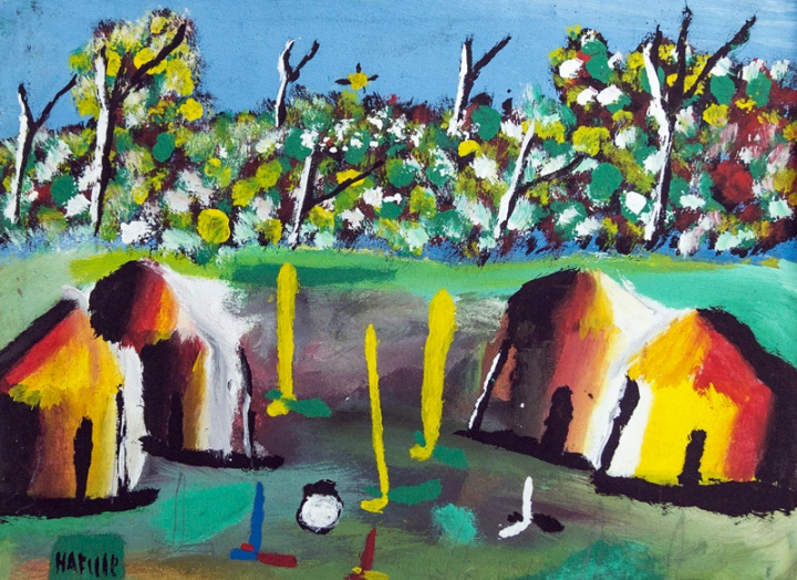 <마을풍경(농업장비 회의), 35.5x130.3cm, 흰 천에 유채, 2017 ⓒ하퍼 카쇼니, 말라위>
