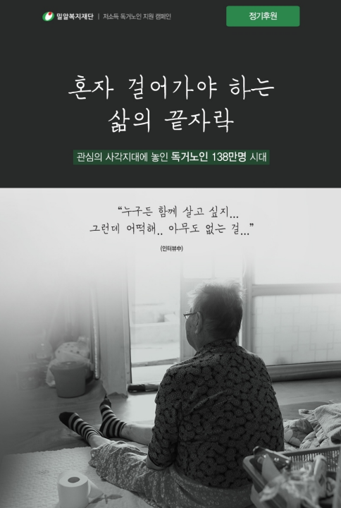 밀알복지재단은 이러한 저소득 독거노인을 지원하는 온라인 캠페인을 펼치고 있습니다. 내년 2월까지 온라인 사이트(http://silvercare.miral.org)를 통해 진행되는 해당 캠페인은 관심의 사각지대에 놓인 독거노인을 알리고 관심과 후원을 독려하는 캠페인입니다.