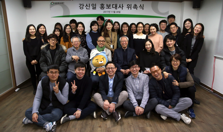 홍보대사 위촉패 전달이 있은 후, 직원들이 함께 준비한 선물을 드리는 시간이 있었습니다. 직원들은 강신일 홍보대사님이 근엄하면서도 귀여운 점이 매력인 유명 캐릭터 ‘라이언’을 닮았다며, 밀알복지재단 아이템으로 무장한 라이언 인형을 선물하였습니다.