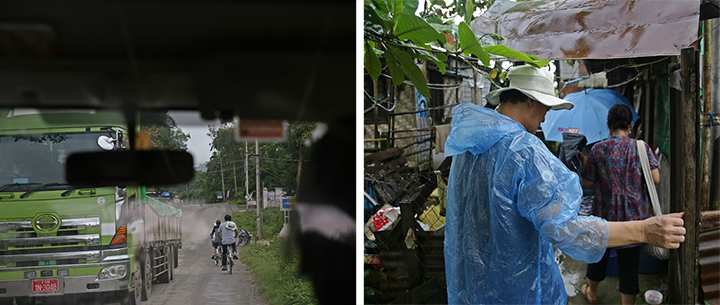 좁은 길목을 다니는 큰 트럭과 자전거(좌), 아이들을 만나러 가는 길(우)