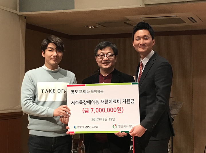 지난 3월 19일(일), 경기도 성남에 위치한 영도교회에서 저소득장애아동 재활치료비 지원금을 밀알복지재단에 기부해주셨습니다. 이 기부금은 영도교회 청년들이 소외계층을 돕기 위한 ‘사랑의 거리’ 행사를 통해 모인 것으로, 밀알복지재단을 통해 어려운 아이들을 위해 쓰이길 바라는 마음을 모아 전달해 주셨습니다.