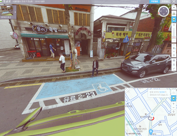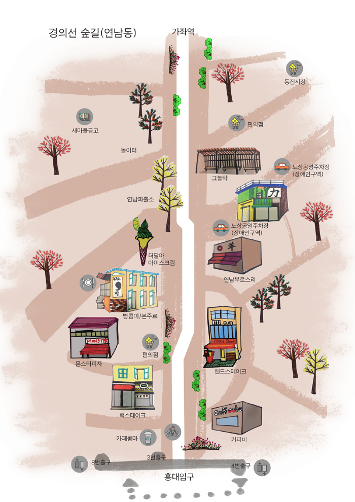 - 차를 가지고 공원에 온다면?연남파출소 건너편, ‘학교앞1교시’라는 가게 앞에 장애인전용 주차장이 있다. 차량으로 이곳을 방문한다면, 이 주차장을 추천한다.