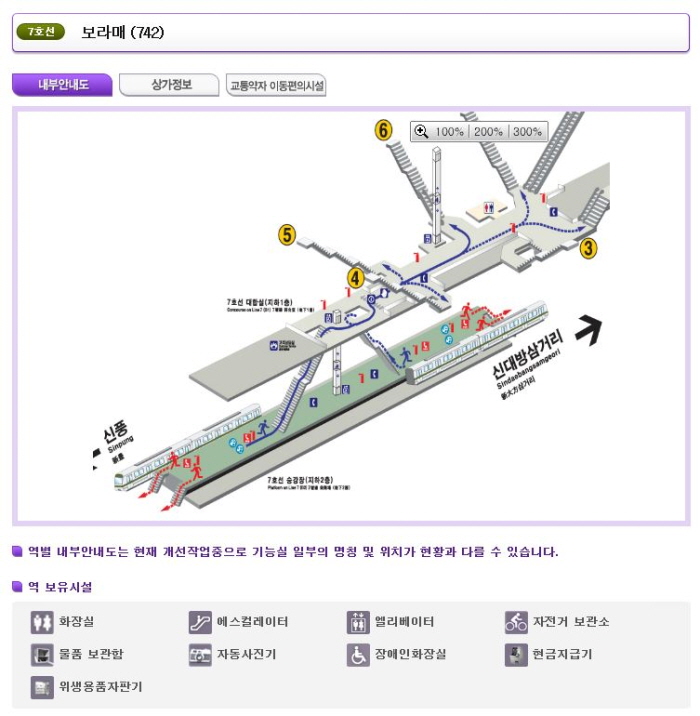 보라매역 내부 안내도. 휠체어 이동시 엘리베이터의 위치나 역 보유시설, 편의시설 등을