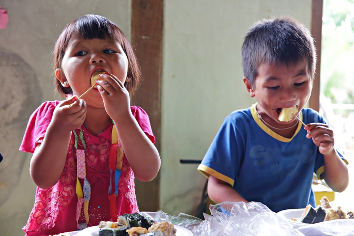 즐거운 식사 시간! 회원님들이 직접 만든 김밥과 치킨, 호떡을 맛있게 먹어 준 아이들
