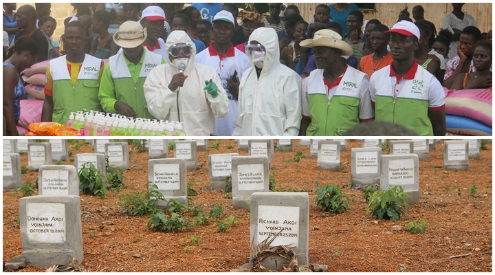 밀알복지재단 에볼라 긴급구호사업 당시(위) / 에볼라 바이러스에 사망한 주민들의 무덤(아래)