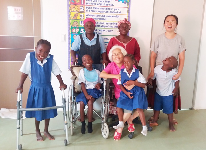 왼쪽 두번째, 휠체어에 앉아있는 시므온과 특수학급 아이들, 선생님의 모습.