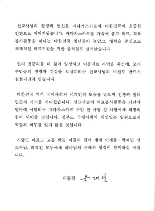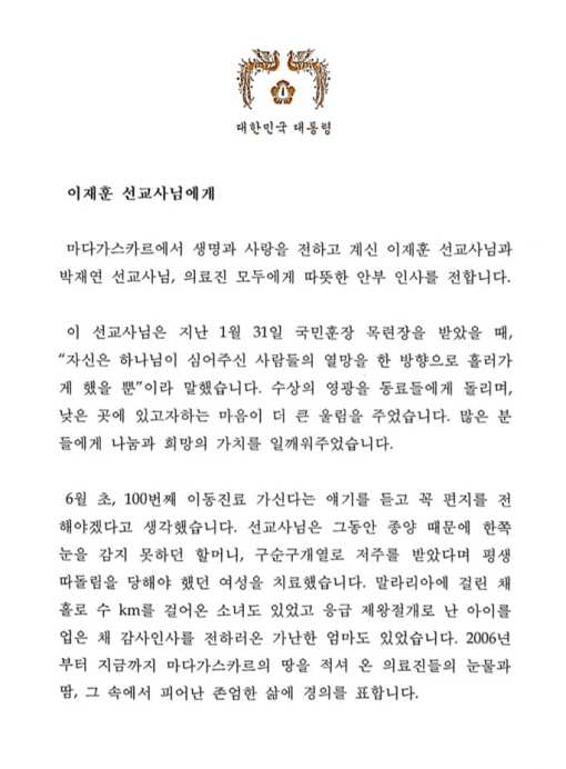이토록 마을 주민들에게 소중한 이동진료가 올 6월 초, 100회를 맞이했습니다. 문재인 대통령께서는 선교사님과 함께하는 의료진에게 축전을 보내주셨으며 8월 7일 마다가스카르 현지에서는 100번째 이동진료를 기념하며 행사를 개최했습니다.